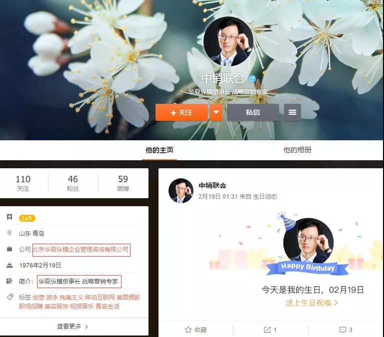 在新浪微博上,找到中销联合的相关账号,并自称为华夏纵横董事长,却只是有一个图片,并没有披露具体姓名,微博资料显示其隶属于北京华夏纵横企业管理咨询有限公司,却没有获得微博的官方企业认证,工商局上也并未查询到有该企业信息,捏造了所谓的公司背景。