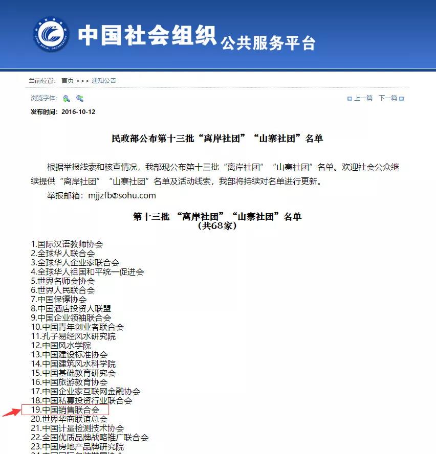 该平台对外宣称岳家军是中国销售联合会会长,但是根据相关资料显示,所谓的中国销售联合会根本就是一个山寨平台,已经被民政部列入了山寨社团名单。