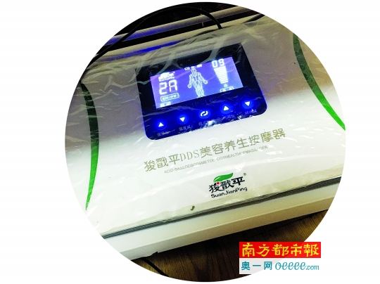 南都记者留意到,用于电疗按摩的设备全称为“华林酸碱平DDS美容养生按摩器”,外形酷似电视机顶盒,有个细小的显示屏,生产厂家标注为“河北华林酸碱平生物技术有限公司”。然而,产品上并未见有任何资质认证。