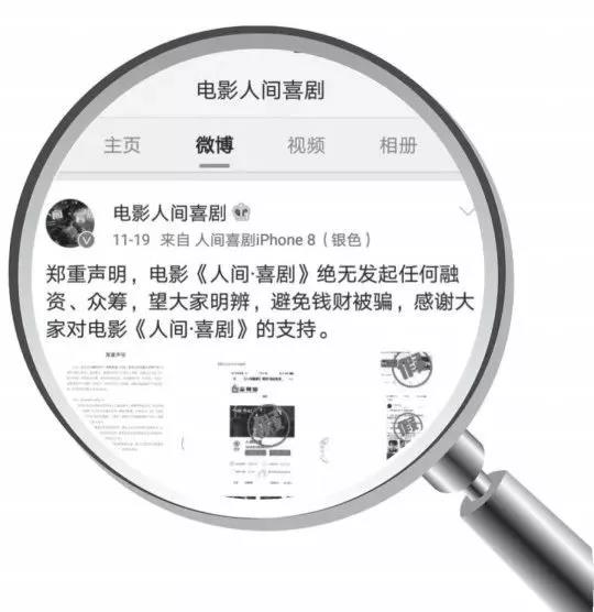 不过,这一消息很快就被官方打脸。11月19日,电影《人间·喜剧》官方微博发布声明,称该电影绝无发起任何融资、众筹,“望大家明辨,避免钱财被骗”。