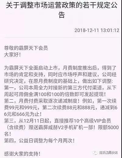 看下今天下午新出来的公告,霸屏天下在9号发出公告,启动月份制度,而且之前花费99元、999元升级的会员,也会消失,今后,每个月都需要交钱,才能领收益。根据公告显示:“2018年11月14日”之前的普通VIP会员将于12月13日24点统一失效,2018年10月15日”之前的高级VIP会员将于12月13日24点统一失效。就是说11月14号之前充的99元跟10月15充值的999元没有了,要想玩,就要充值会员。还TMD不要脸的说为了上市,相信很多会员还没有回本呢?