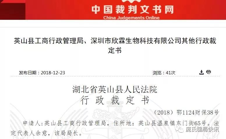 12月20日,湖北省英山县人民法院公示一则行政裁定书,英山县工商行政管理局认为深圳市欣霖生物科技有限公司(以下简称“欣霖生物”)涉嫌传销,可能逃避执行,于2018年12月20日向湖北省英山县人民法院提出申请,要求冻结其的银行存款。经审查,依照相关法律规定,英山县人民法院裁定冻结深圳市欣霖生物科技有限公司的银行存款12万元一年时间。