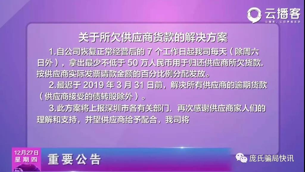 该通知还称,根据公司目前经营状况,以及与深圳市政府,大部分供应商的协商沟通,决定自公司恢复正常经营后的7个工作日起每天拿出最少不低于50万元,按供应商实际发票欠款金额的百分比例分配归还供应商的所有欠货款。最迟于2019年3月31日前,解決所有供应商的逾期货款。先前已经接受债转股的供应商不在此列。