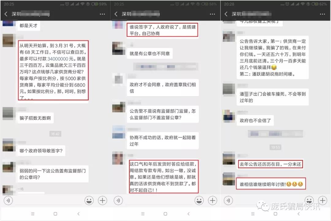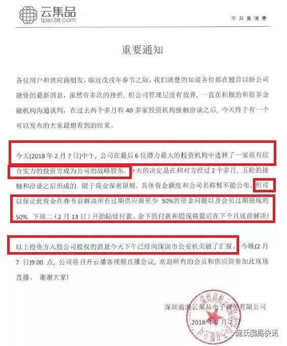 2018年2月7日,云集品公司发布《重要通知》称,“公司在6位潜力最大的投资机构中选择了一家很有综合实力的投资方成为公司的战略股东,可以保证此资金在春节前解决所有过期供应商至少50%的资金问题以及会员过期提现的50%,今天下午已经向深圳市公安机关做了汇报。并承诺付款和提现最迟在下个月底前全部解决。”结果云集品公司又没有解决。