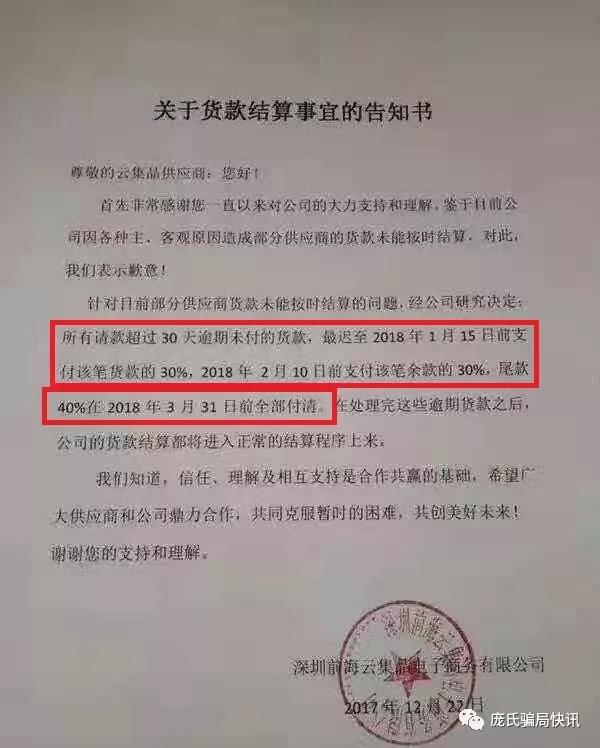去年的12月22日,云集品公司发布《关于货款结算事宜的告知书》,承诺供应在2018年3月31日前全部付清。结果云集品公司并没有兑现承诺。