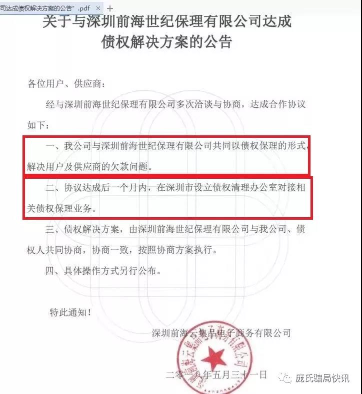 2月7日,云集品公司发布《关于与深圳前海世纪保理有限公司达成债权解决方案的公告》。该公告称,云集品公司与深圳前海世纪保理有限公司达成合作协议。双方共同以债权保理的形式,解决用户及供应商的欠款问题。协议达成后,一个月内, 在深圳市设立债权清理办公室对接相关债权保理业务。结果云集品公司再次让供应商们失望了。