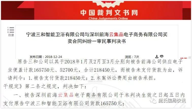 其中慈溪市长河镇一家公司告云集品公司拖欠坐便盖货款的,12月3日,浙江省慈溪市人民法院判令云集品公司支付该公司货款165750元。另外,北京市西城区一家公司告云集品公司拖欠餐费156160元。