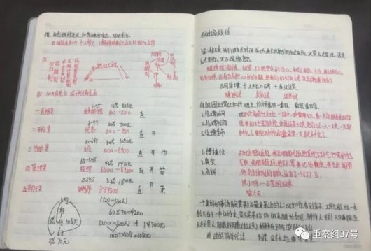 ▲在传销窝点,警方查获的传销笔记上,记录了组织架构、奖金分配制度等内容。警方供图
