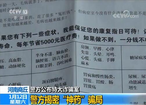 近日,河南商丘民权县公安局公布了一起特大诈骗案的相关细节,揭露一个诈骗团伙的诈骗手段。这个诈骗团伙通过虚假宣传,把成本不到10块钱的药品,卖到上千元,作案时间长达十年,受骗人数超过了十万人,涉案资金上亿元。