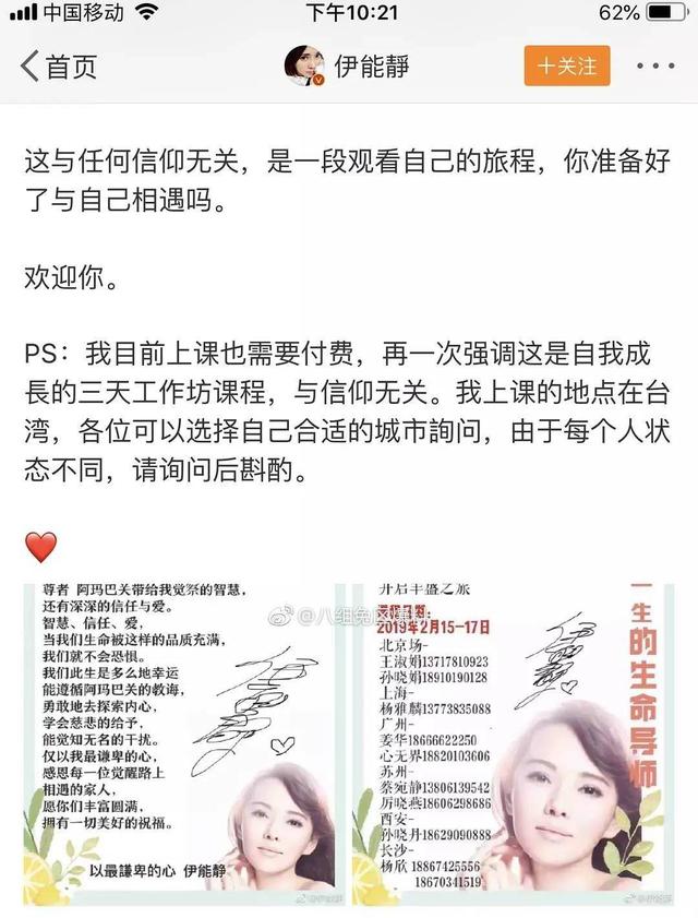 “我目前上课也需要付费,再一次强调这是自我成长的三天工作坊课程,与信仰无关。”长文最后,伊能静附上了所谓心灵课程的介绍,以及课程日期和6个城市相关联系人的电话号码。