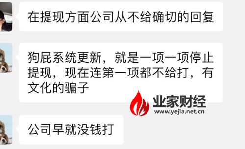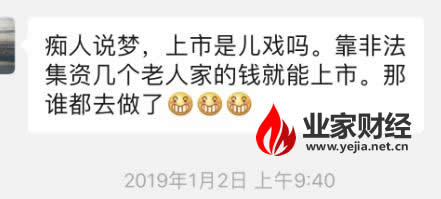 “痴人说梦,上市是儿戏吗?靠非法集资几个老人家的钱就能上市,那谁都去做了。”一投资会员在微信群揭露“上市计划”说道,并劝大家坚持提现到账才是硬道理。针对湖南九云珠、今珠生物股份肆意践踏投资会员权益,并随意许诺上市及高额回报一事,业家财经将持续关注,并将所掌握的情况反馈给辖区执法部门。
