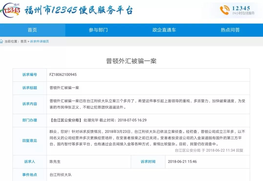 记者调查了解到,和上述投资者遭遇相同,早在2018年6月21日,便有福建省福州市投资者投诉PTFX普顿涉嫌诈骗,福州市台江区公安分局通过“福州市12345便民服务平台”回复称:2018年3月23日,台江刑侦大队已依法立案侦查。经初查,PTFX普顿公司成立三年多,以不同名义的公司经营并多次更换经营场所,在受害者报案之前已关闭。受害者投资该公司的入金渠道既有国外的第三方平台、国内智付等多家平台,也有通过会员间接入金等各种方式,案情比较复杂,民警目前仍在调查中。