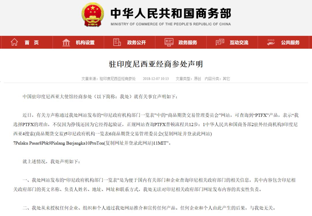 但PTFX普顿膨胀般的自信换来的却是响亮的“打脸声”,2018年12月7日,商务部通过官网发布“驻印度尼西亚经商参处声明”称:经参处网站发布的“印尼政府机构部门一览表”是为便于国内有关部门和企业查询印尼相关政府部门的相关信息,其中内容包含印尼相关政府部门的英文名称、负责人姓名、地址、网址和联系方式,经参处无法对印尼相关政府部门网址发布内容的真实性负责。经参处从未授权任何企业、组织和个人通过我处网站推介和宣传任何产品。任何企业和个人由此产生的后果,与经参处无关。