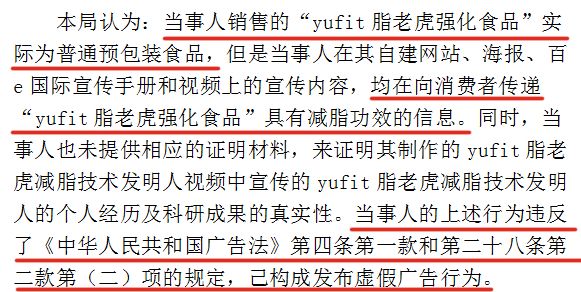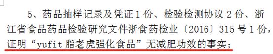 上文中提到的处罚决定书中也写到,证明“yufit脂老虎强化食品”无减肥功效的事实。