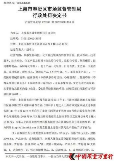 上海莱芙蔻经销商宣传“对抗癌症”遭当局处罚