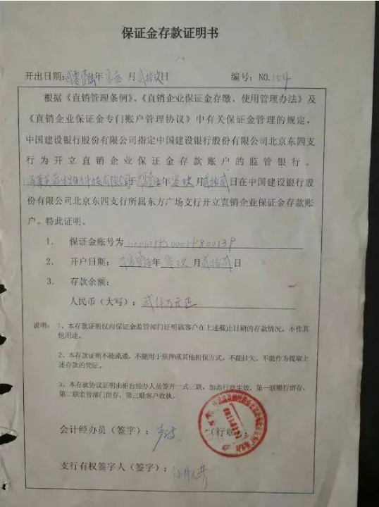 据发现,《保证金存款证明书》显示,开户日期为2015年9月22日,开出日期为2016年3月29日。编号为154。《存款开户证实书》显示,存放期限为2016年4月12日至2017年4月12日,总共一年时间。据此,有李姓经销商在宣传时向别人表示:“这是公司的保证金手续,你可以用作团队内部了解,今年百分百直销牌照下来。”