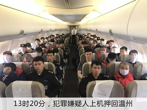 澎湃新闻从公安部刑侦局微信公号了解到,2月21日17时,随着中国民航包机缓缓降落在温州龙湾国际机场,42名对温州实施电信诈骗的犯罪嫌疑人被温州市公安局民警从海南儋州羁押回温州。
