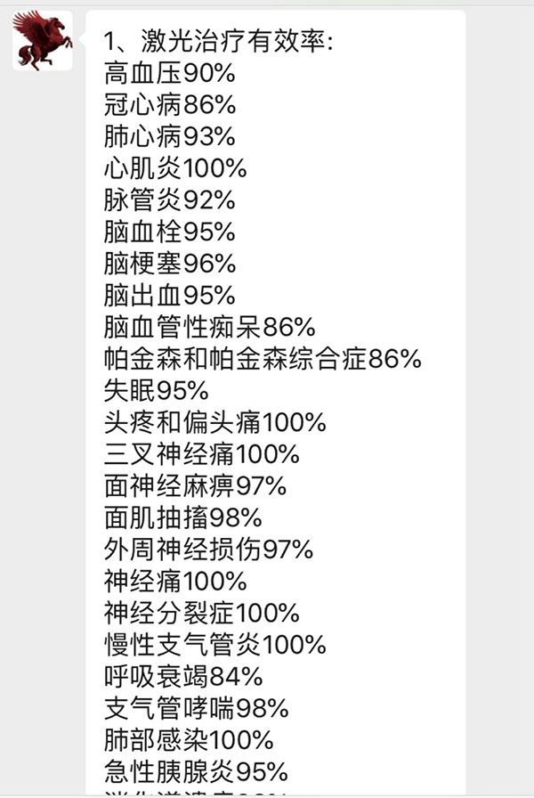 该代理商称,激光治疗仪对一百种疾病均有治疗效果。他还发来一张“治疗有效率”的表格称,激光治疗仪治疗有效的疾病涵盖脑血栓、帕金森、慢性肾功能疾病、白癜风、支气管哮喘、功能性子宫出血、支气管哮喘、男性性功能低下等66种,其中心肌炎、三叉神经痛、神经分裂症、慢性支气管炎、痛经、弱视等33种疾病的治疗有效率,更是达到了100%。