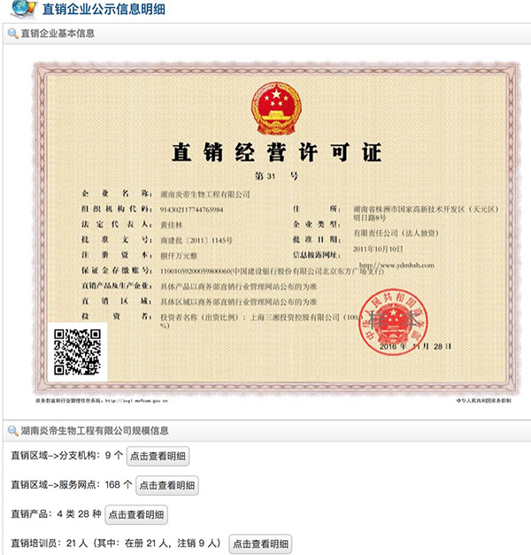 此外,商务部直销企业公示信息显示,炎帝生物经核准的直销区域仅包括湖北、江西、山东、湖南、浙江、辽宁、陕西、广西和山西9省。炎帝生物人士向澎湃新闻证实,其直销区域为9省38市。但炎帝生物官网显示的分公司却遍及全国16省、3个直辖市和4个自治区。