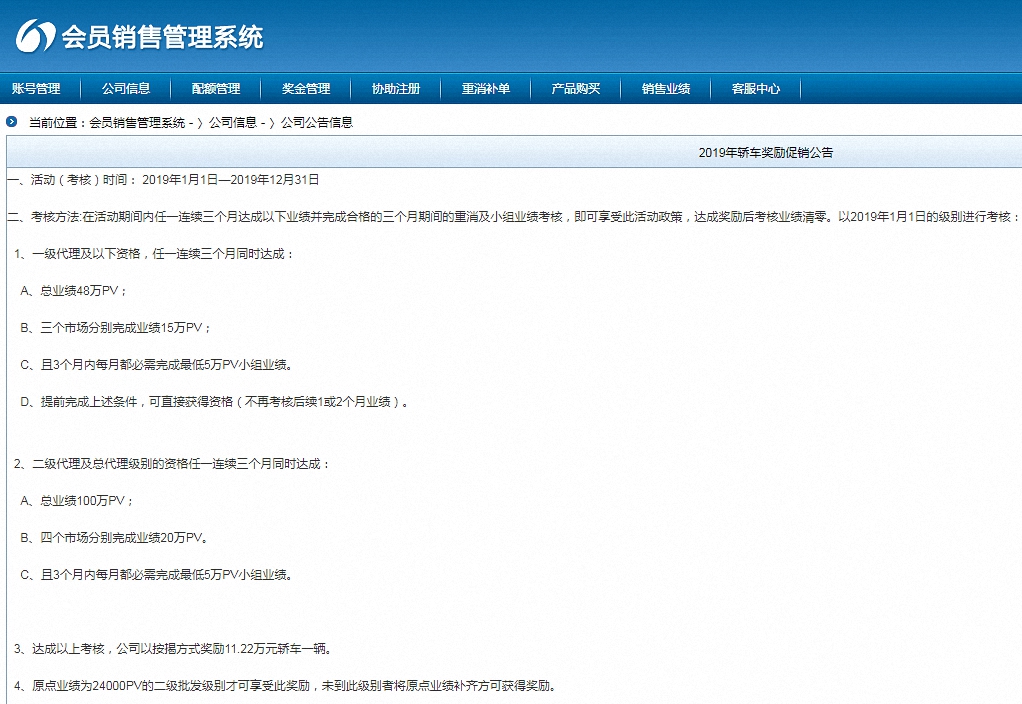 不过,2月22日,“炎帝生物受害群”一名炎帝生物会员向澎湃新闻提供的截图显示,炎帝生物会员销售管理系统网站(www.czmhsh.cn)一则2019年1月至12月的活动(考核)介绍中,每个级别的代理都有设定的业绩,级别越高,所需完成的业绩量就越高。以一级代理为例,需连续三个月完成总业绩48万PV。PV是销售额的计算单位,是每名会员所有下线会员的消费额乘以0.8得出的数值。此外,在会员当前状态栏下还写有一行提示:“会员半年不经营系统自动停权,1年及以上自动停删”。