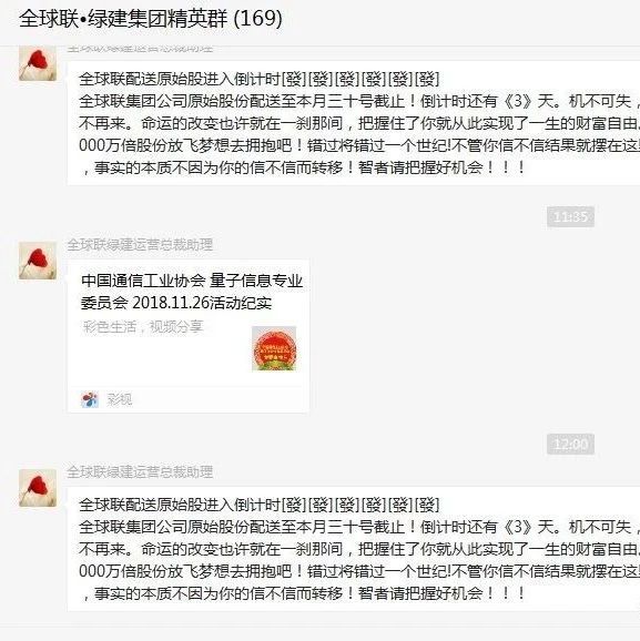 为了更好向市民兜售全球联的股权,全球联不断鼓吹购买其股份就可以实现一生财富自由,还鼓吹其股份会有2000万倍涨幅,各种洗脑词语充斥其中。业家财经在此提醒广大读者,以高额回报许诺进行股权出售涉嫌非法集资,非法集资案件造成的损失由投资人自行承担。各种非法集资项目层出不穷并且披着不同的外衣,给投资人造成了识别困难。