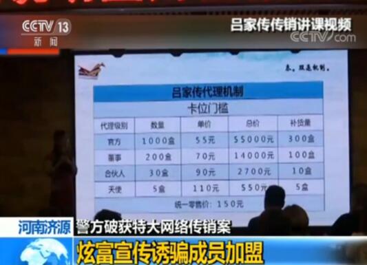 警方介绍,吕家传这种销售行为,产品价格与实际价值严重背离,而销售主要是以拉人头和发展下线为获利方式的行为,明显涉嫌传销犯罪。在掌握大量证据的基础上,济源警方于2018年9月初展开了收网行动,抓获吕家传特大网络传销组织犯罪嫌疑人44人,截至目前冻结、查扣现金、车辆、房产超10亿元。