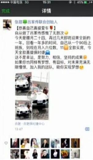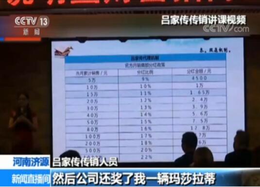 吕家传传销人员:四月份的时候,我提货提了4000多万,公司给我发分红,把所有分红给到我这里,我一下子进来900多万的分红,然后公司还奖了我一辆玛莎拉蒂,170万的车。