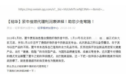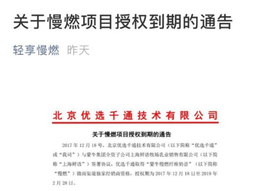 3 月21 日晚,北京优选千通技术有限公司在微信公号上发表《关于慢燃项目授权到期的公告》,称公司在2017 年12 月18 日与蒙牛全资子公司上海鲜语牧场乳业销售有限公司签署协议,取得慢燃纤维奶昔的微商渠道独家经销商资格,授权期到2019年2 月28 日。