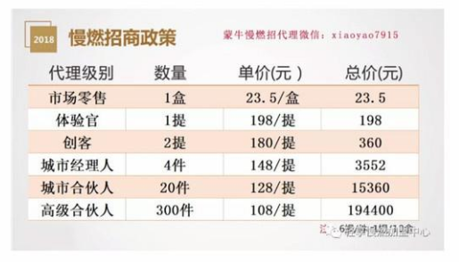 据一位慢燃前代理去年8月披露的招商政策,当时慢燃代理层级由低到高共分为体验官、创客、城市经理人、城市合伙人、高级合伙人5个级别。其中,创客、体验官被归为“零售”;高级合伙人可以招募城市经理人、间招城市合伙人,直招城市合伙人、高级合伙人。