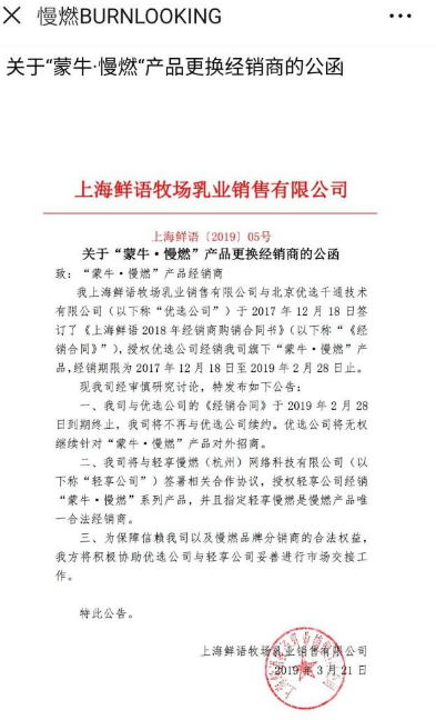 3月21日,慢燃新官方微信发布《关于“蒙牛·慢燃”产品更换经销商的公函》,称上海鲜语牧场乳业销售有限公司与优选千通合同终止后不再续约,优选千通无权继续针对慢燃产品对外招商。上海鲜语已与轻享慢燃(杭州)网络科技有限公司签署合作协议,并指定轻享公司为慢燃产品唯一合法经销商。同时,上海鲜语“将积极协助优选千通与轻享公司妥善进行市场交接工作”。