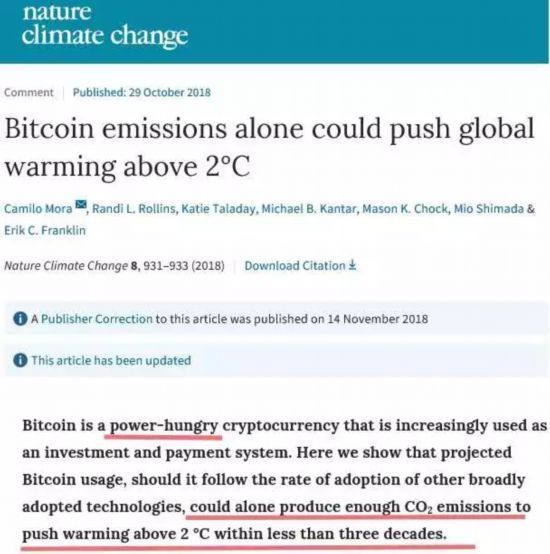 2018年10月发表在期刊Nature Climate Change上的一篇论文显示,仅挖比特币一项就将导致2033年全球气温上升2℃。