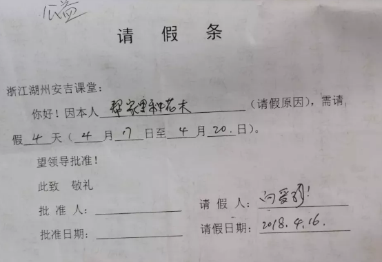 如果在上课的时候有事需要请假,必须得上报东望集团华东区进行审批。在现场就发现了一张未审核通过的请假条,请假时间为2018年4月17至20日,为期4天,请假理由为:帮家里种花木。