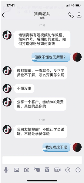 “原本想学习如何在抖音平台上涨粉和经营账号。”一个月前,胡翰在网友的推荐下,加入一个有70多个学员的抖商培训群中。但在支付1600元学费后,他很快发现,这些所谓的“培训专家”对抖音并不如其所说般精通,“感觉就是传统电商人员换了个皮,来骗我这种抖商小白的。”