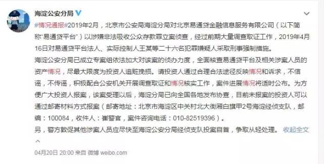 4月20日,北京市公安局海淀分局在其官方微博通报了P2P平台“易通贷”涉嫌非法吸收公众存款案最新进展。通报显示,警方已于2019年4月16日对易通贷平台法人、实际控制人王某等二十六名犯罪嫌疑人采取刑事强制措施。
