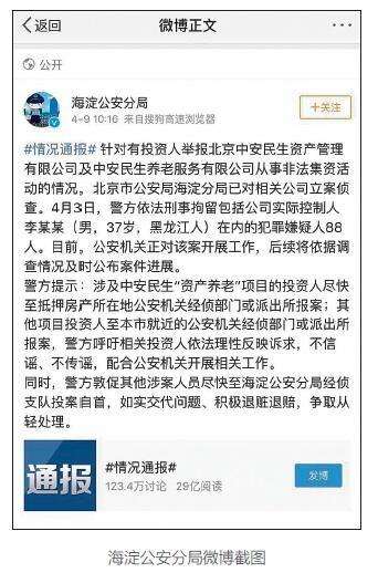 4月9日,北京市公安局海淀分局官方微博通报称,针对有投资人举报北京中安民生资产管理有限公司及中安民生养老服务有限公司从事非法集资活动的情况,北京市公安局海淀分局已对相关公司立案侦查。