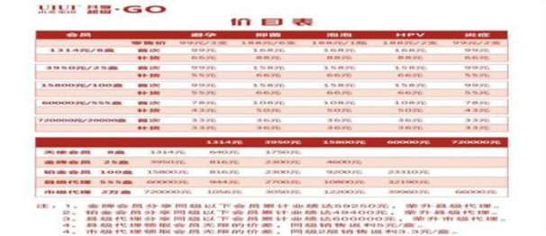交费成为县代后,首次拿货价108元/盒,二次拿货价50元/盒,发展1个金牌会员奖励2700元,发展1个铂金会员奖励10800元,发展1个县代奖励32190元,发展10个县代自动晋升到市代。