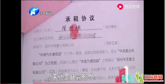 近日,据中牟的陈女士女士反映,在郑州华美汽车博览园售楼部买了四套商铺,本来签的合同约定三年内由开发商托管,并向陈女士返还租金。可刚过了半年开发商就不认合同了,甚至耍赖的说:我没钱,怎么给返你房租。