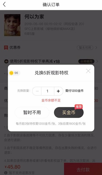 优惠电影票活动标明,使用“5折观影特权”需付1200金币,充值金额只有500金币、1000金币、2000金币等6档整数充值额,并没有1200金币一档。这意味着,用户想要享受优惠价,账户内金币不足,不得不充值2000金币。按2000金币售价20元折算,1200金币价值12元。