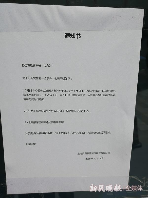 今天上午,多位家长来到了这家“贝易教育”,但一楼“铁将军把门”,门上近一半的招牌已不翼而飞,一纸落款日期为4月29日的“通知书”称:“所有中心(‘贝易教育在杨浦、宝山等区均有分中心’)即日起暂时停课,复课时间另行通知”;后门进去后,位于地下一层的总部办公室内,除了一男一女两位自称前来取私人物品的普通职员外,只有一个销售人员王女士。