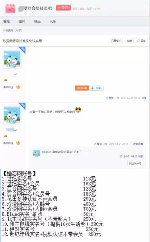 在某贴吧,小李联系到了自称出售*爱网账号的人,此人几乎出售所有知名婚恋平台的实名认证账号,并可根据买家对性别、年龄、户籍等要求进行定制。