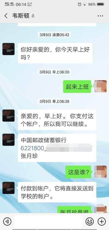 按照Billy提供的账号,李莹准备给对方转账5000元,但前两次都被微信拦截。李莹质疑Billy是骗子,Billy表现得非常委屈,用蹩脚的中文劝李莹:“谢谢你浪费我的时间,现在你让雷蒙德先生认为我是在开玩笑……对孩子来说,让他们的母亲去过伟大的牛津大学也是一件好事……我亲爱的只是明白我想让你理解的东西,也许是因为你所说的是英国人和中国人的思维方式不同。”