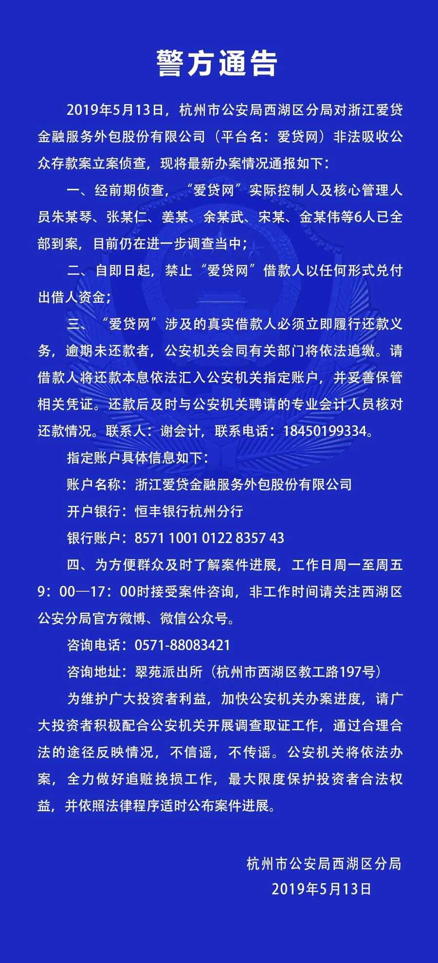 5月13日,杭州市公安局西湖区分局发布案件情况通报,称对P2P平台爱贷网(浙江爱贷金融服务外包股份有限公司)非法吸收公众存款案立案侦查,并将依法办案,全力做好追赃挽损工作,最大限度保护投资者合法权益。