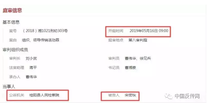 经过办案组的长时间对宋密秋犯罪证据的核查整理,证据确凿,于昨日湖南省桂阳县人民检察院对“云数贸”"五行币"特大网络传销团伙首犯宋密秋(张建)进行公开开庭审理,庭审时间经历长达5个小时。