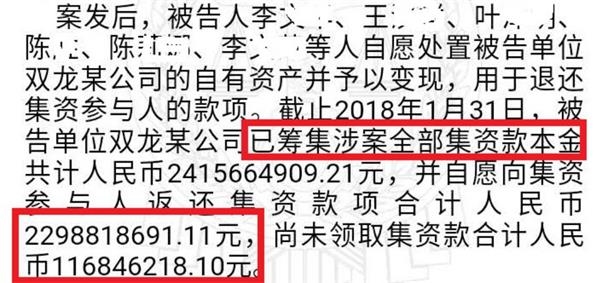 截止2018年1月31日,被告单位双龙某公司已筹集涉案全部集资款本金共计人民币24.1566亿元,并自愿向集资参与人返还集资款项合计人民币22.9882亿元,尚未领取集资款合计人民币1.1685亿元。