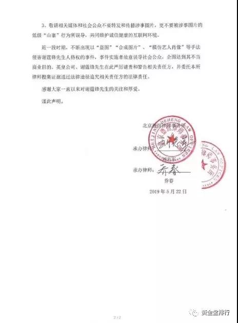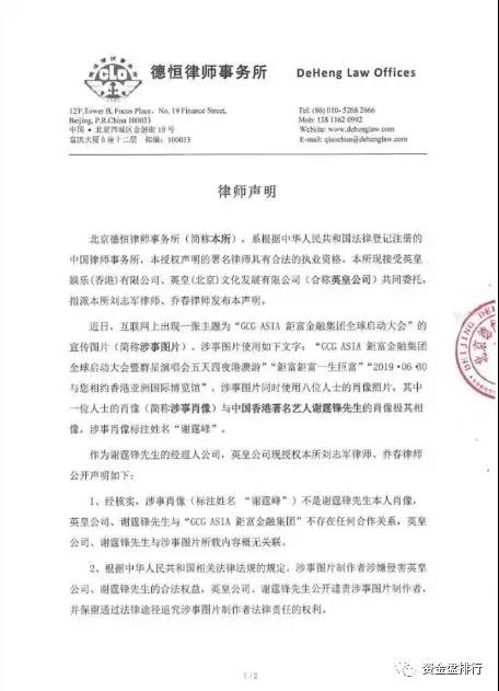 因涉嫌利用明星肖像权,律师事务所也是针对钜富金融集团违法发表声明,称未和钜富金融集团合作,纯属恶意编造,将保留利用法律手段对涉事图片制造者追究法律的责任。