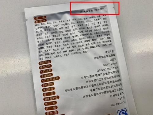 中国网财经记者通过团购优惠活动以120元购入一盒“159素食全餐”,发现其产品背面品名有“固体饮料”字眼。其产品生产许可证编号属于“长春广和堂医药科技有限公司”,其允许生产的产品范围也为固体饮料。