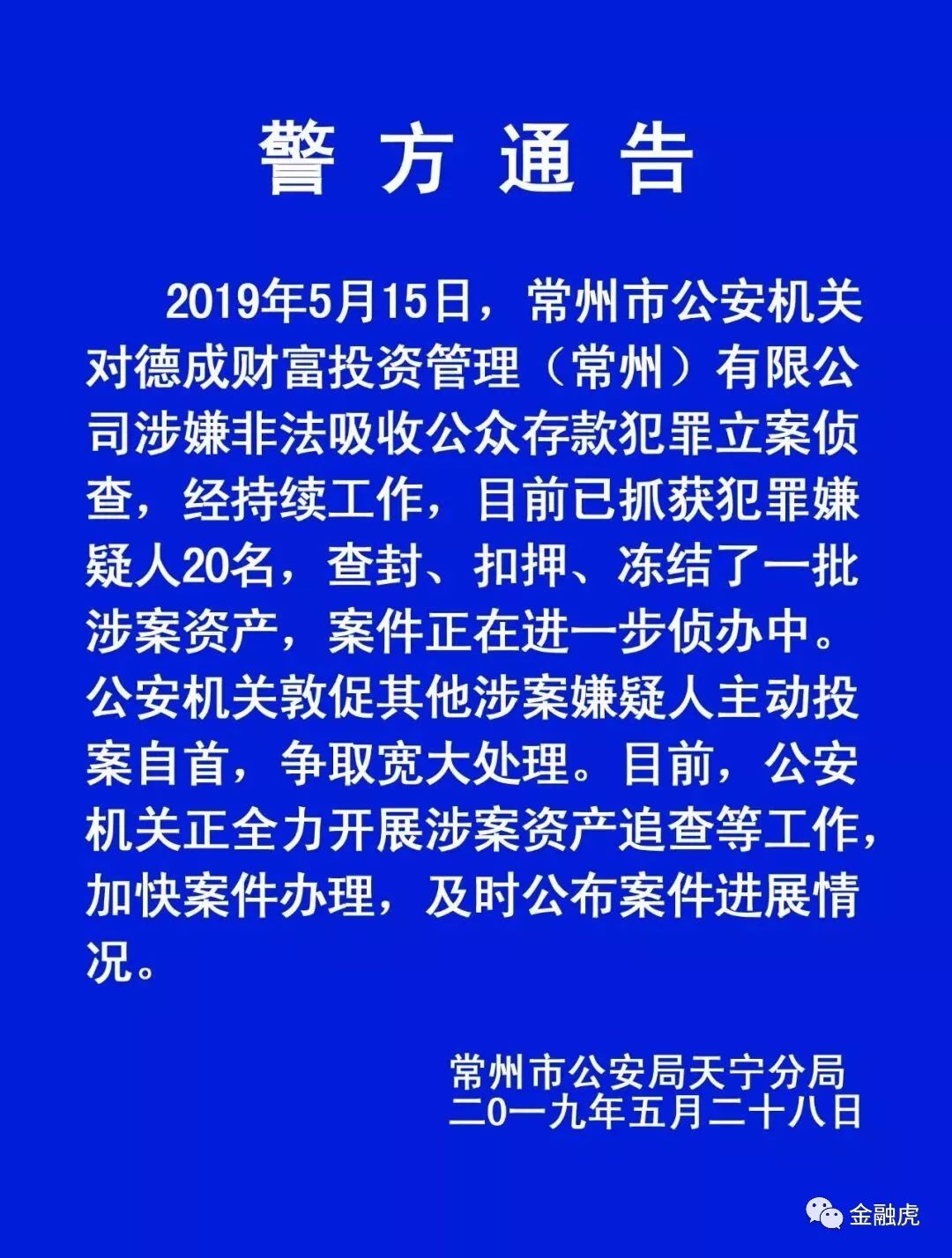 5月28日消息,今日,常州市公安局天宁分局发布最新通报显示,2019年5月15日,常州市公安机关对德成财富投资管理(常州)有限公司涉嫌非法吸收公众存款犯罪立案侦查,经持续工作,目前已抓获犯罪嫌疑人20名,查封、扣押、冻结了一批涉案资产,案件正在进步侦办中。