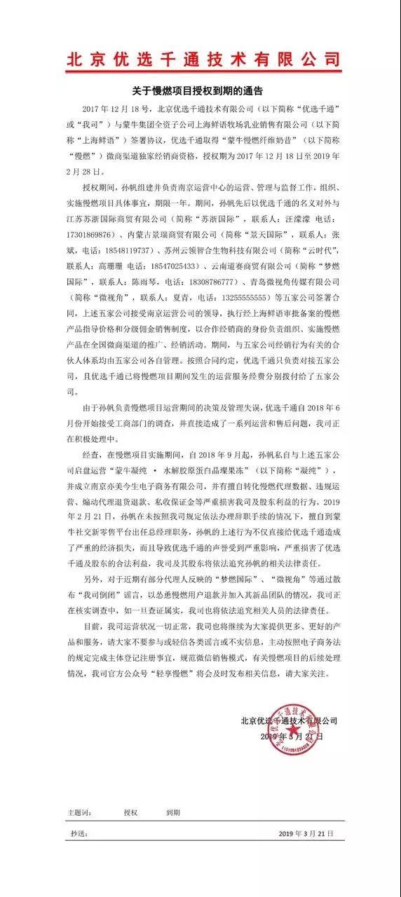 3月21日,慢燃新官方微信发布《关于“蒙牛·慢燃”产品更换经销商的公函》,称上海鲜语牧场乳业销售有限公司与优选千通合同终止后不再续约,优选千通无权继续针对慢燃产品对外招商。上海鲜语已与轻享慢燃(杭州)网络科技有限公司签署合作协议,并指定轻享公司为慢燃产品唯一合法经销商。同时,上海鲜语“将积极协助优选千通与轻享公司妥善进行市场交接工作”。