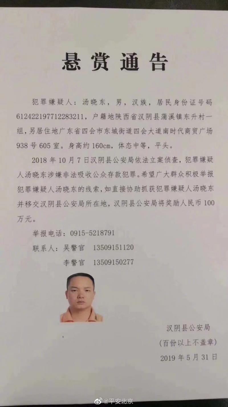 2018年10月7日汉阴县公安局依法立案侦查,犯罪嫌疑人汤晓东涉嫌非法吸收公众存款犯罪。希望广大群众积极举报犯罪嫌疑人汤晓东的线索。如直接协助抓获犯罪嫌疑人汤晓东并移交汉阴县公安局所在地,汉阴县公安局将奖励人民币100万元。