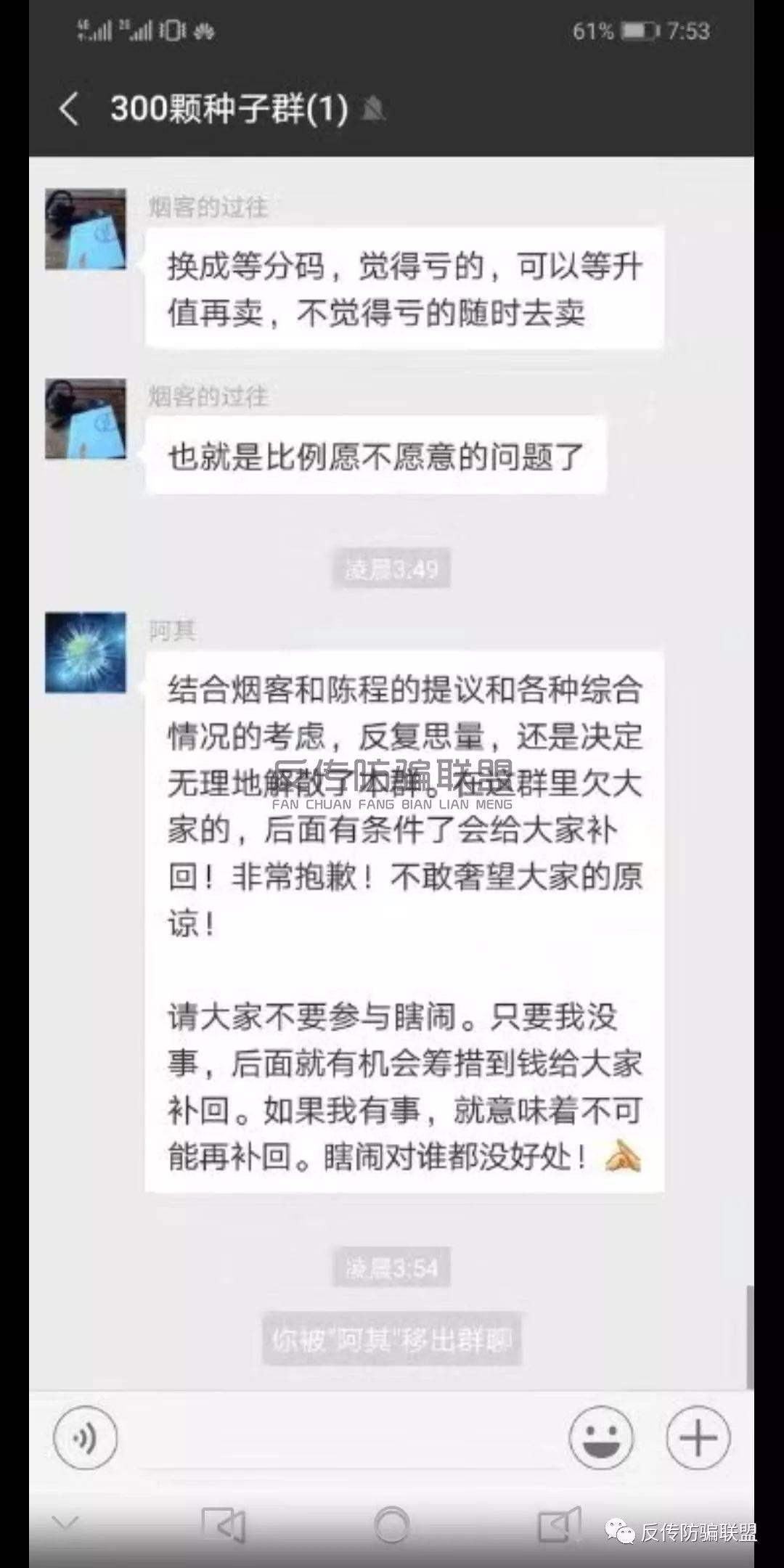 客服和内托安抚大家,说“抱团取暖”,统一交给平台处理,平台统一售卖,卖出了的钱再分给大家!每个会员想要自由售卖还得充值进去买,宣传人“李简其”经常在群里发各种“正能量”。后期投资人关注一下还真涨了不少,开盘价从0.037涨到了0.1,因为觉得靠平台每天售卖分的那点钱很难回本,投资人于是又决定二次投资。